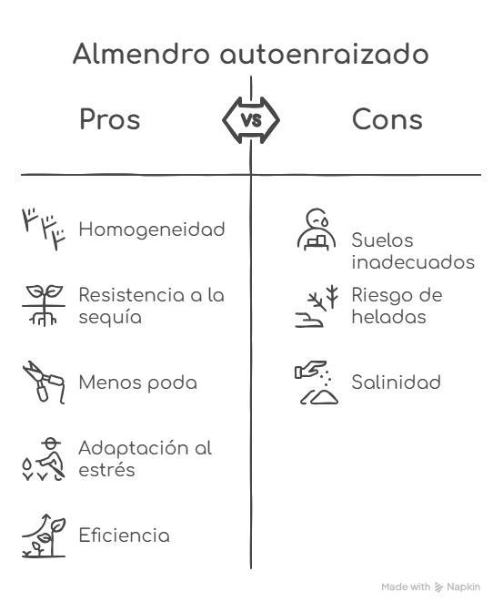 Aunque el almendro autoenraizado puede mostrar menor diámetro de tronco en los primeros años, su eficiencia productiva y simplicidad de manejo pueden superarlo en muchos casos.