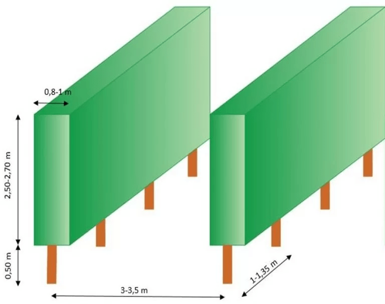Este sistema busca un muro vegetal continuo, homogéneo y productivo desde el tercer año.